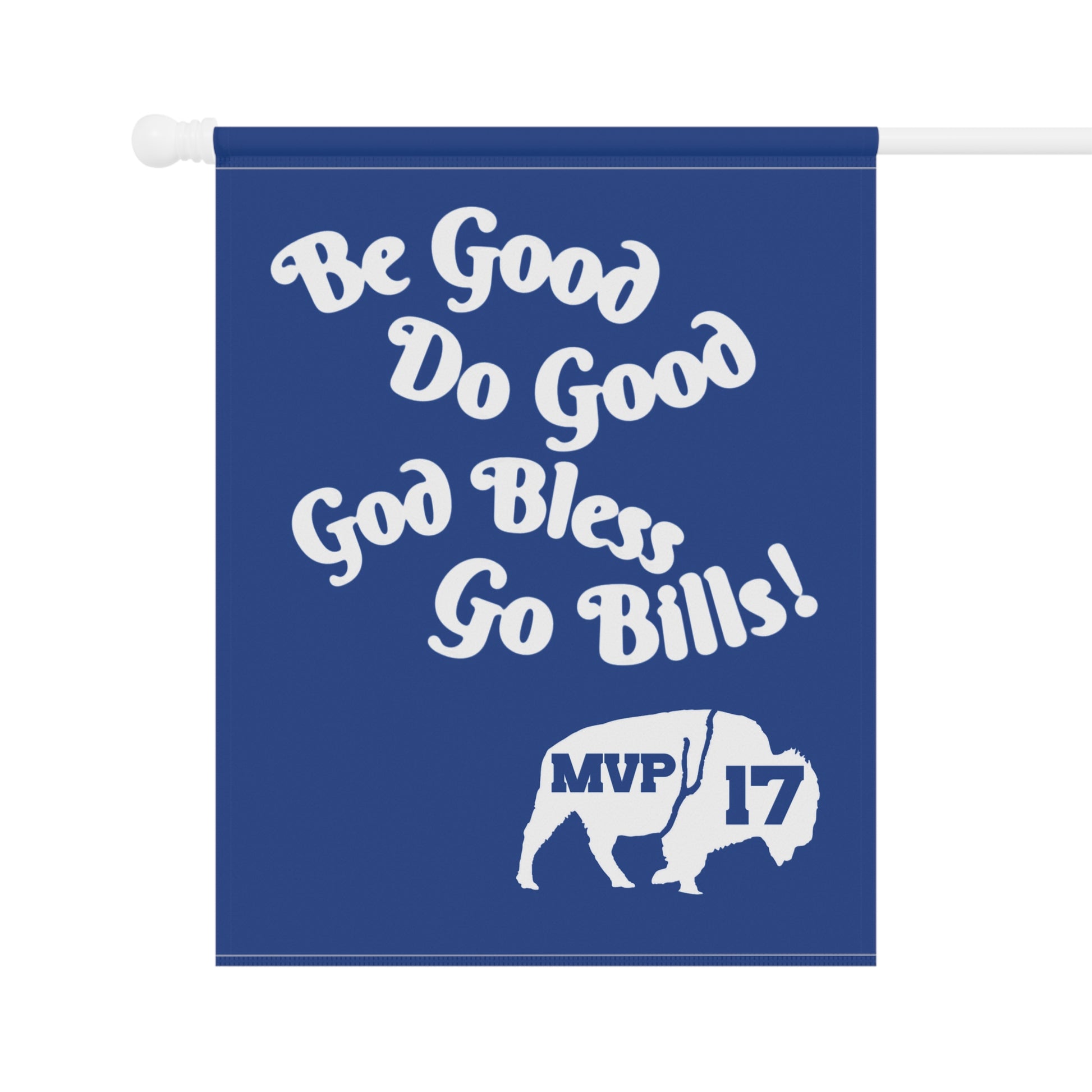 A vibrant and motivational garden & house banner featuring MVP 17's quote 'Be Good, Do Good, God Bless, Go Bills'. This lightweight banner with a sleeve at the top is perfect for showcasing your team spirit and positivity. Ideal for Buffalo Bills fans, sports enthusiasts, and anyone looking to add a pop of color to their outdoor space. Great for game days, sports events, and everyday inspiration.
